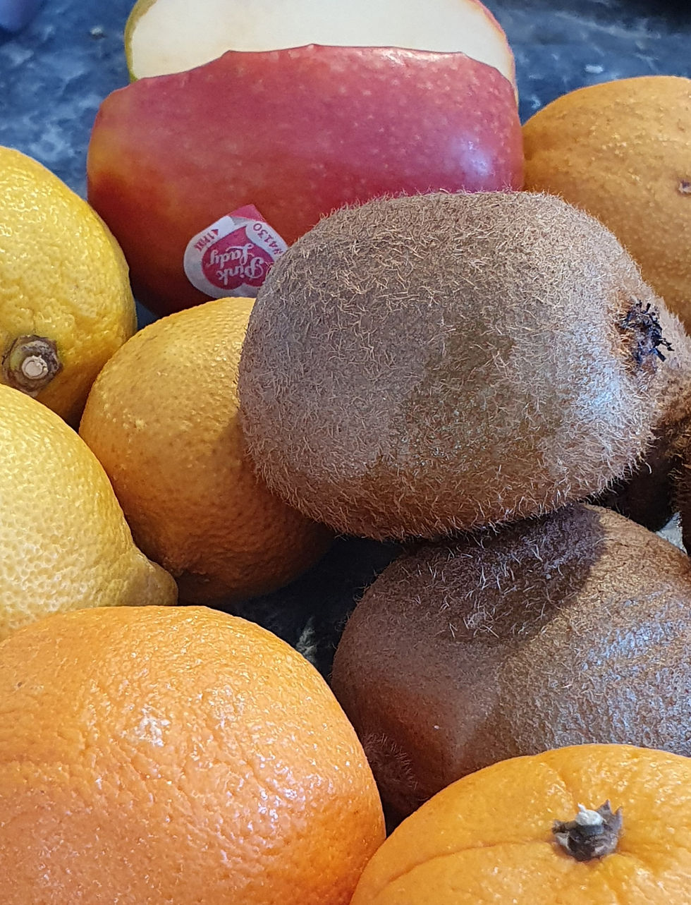 2 oranges, 4 citrons, 4 kiwis et les ¾ d’une pomme, car Zaza, amazone à front bleu de la cabane a déjà boulottée le premier quart !